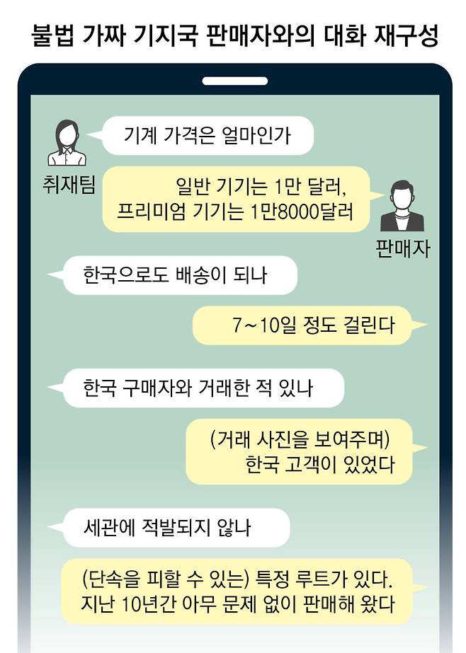 22일 동아일보 취재팀이 일명 ‘가짜 기지국’이라 불리는 중국의 펨토셀 판매업자에게 “한국 세관에 적발되지 않고 장비를 들여올 수 있느냐”고 묻자 돌아온 답변이다.