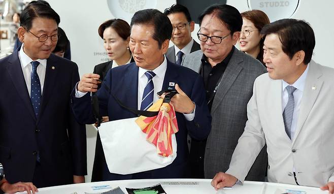 | 부산영화제 ‘굿즈’ 구입 더불어민주당 정청래 대표가 23일 부산 해운대구 영화의전당에서 제30회 부산국제영화제 현장을 둘러보며 굿즈를 구입하고 있다. 앞서 정 대표는 부울경(부산·울산·경남) 예산정책협의회에 참석해 “부울경 30분 시대를 위해 모든 역량을 다하겠다”며 교통 인프라 사업 추진 의지를 밝혔다. 부산=뉴시스 |