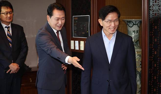 | 26일만에 만난 장동혁-김문수 국민의힘 장동혁 대표(가운데)가 23일 서울 여의도의 한 중식당에서 김문수 전 고용노동부 장관(오른쪽)을 만나 자리를 안내하고 있다. 두 사람이 만난 건 지난달 전당대회에서 당 대표 자리를 놓고 경쟁한 지 26일 만이다. 뉴스1 |