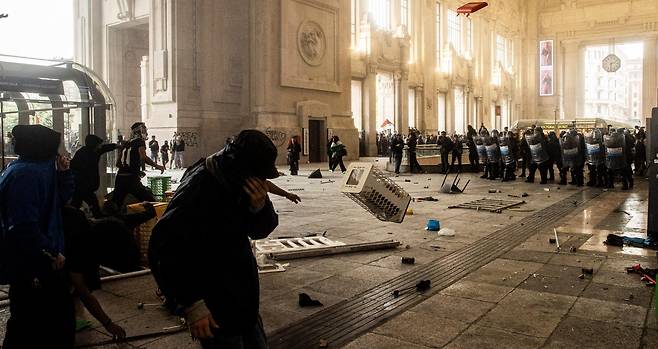 | 밀라노 역에서 팔 지지 격렬 시위 22일 이탈리아 밀라노 중앙역에서 팔레스타인 지지 시위대가 진압 경찰을 향해 집기들을 내던지고 있다. 시위 주최 측은 밀라노에서만 약 5만 명이 팔레스타인 지지 행진을 벌였다고 밝혔다. 최근 영국, 프랑스가 이스라엘의 가자 공습을 규탄하며 팔레스타인 국가 인정에 나섰지만, 조르자 멜로니 이탈리아 총리가 이에 동참하지 않자 이탈리아 전역에서 반정부 시위가 벌어졌다. 밀라노=AP뉴시스 |