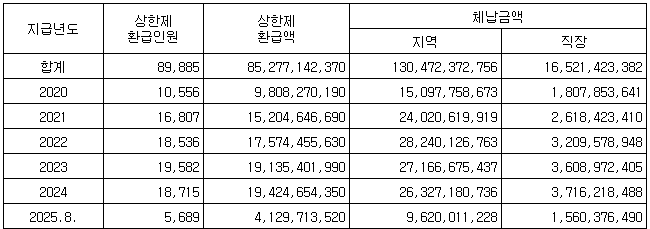 주2) 체납금액 : 1년 이상 체납자('25.8.10.기준)가 연도별('20∼'25.8월)로 본인부담상한제 환급금을 지급 받은 경우 체납금액이 중복 합산될 수 있음