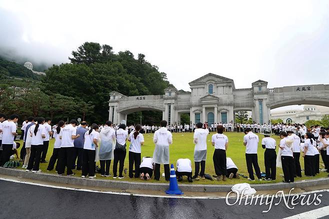 | ▲ 김건희 의혹을 수사하는 민중기 특별검사팀이 '건진법사 게이트'와 관련해 지난 7월 18일 오전 경기도 가평군 통일교 천정궁에 대한 압수수색을 시작한 모습. 통일교 청년 신도들이 천정궁 입구에서 기도와 노래를 하고 있다. |