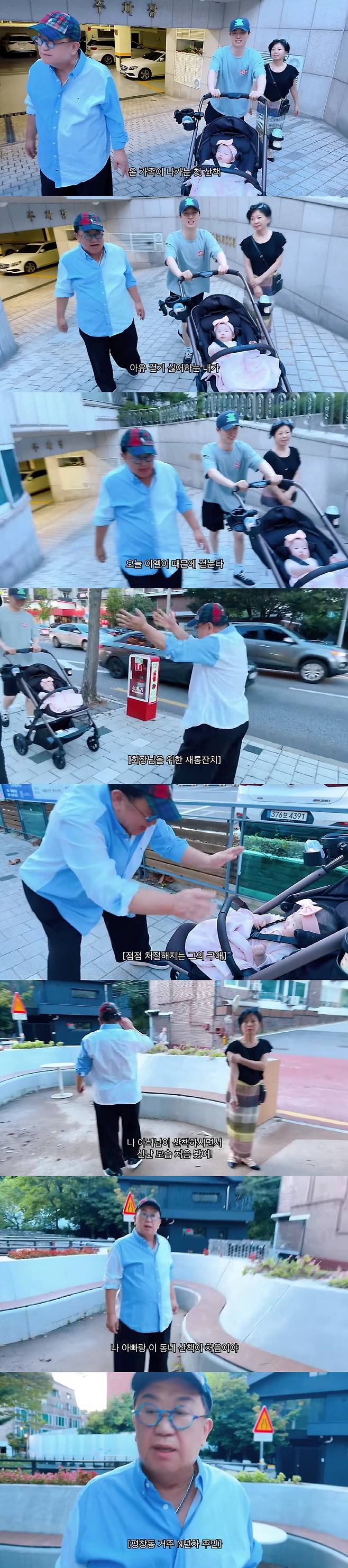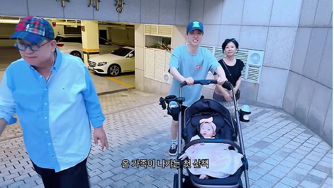 이날 영상에서는 이용식의 딸 이수민이 부모님, 남편 원혁, 그리고 딸 이엘 양과 함께 동네 산책에 나서는 모습이 그려졌다. 이수민은 "온 가족이 함께 나가는 첫 산책이다. 이엘이 덕분에 할아버지도 산책에 나선다"며 설렘을 드러냈다.