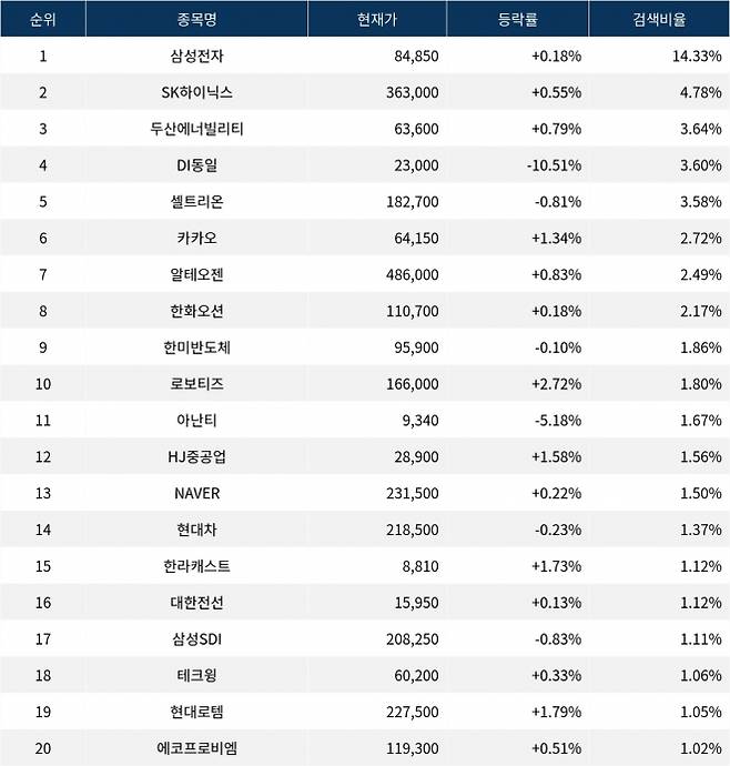 이어 SK하이닉스(000660)가 검색비율 2위를 기록하며 0.55%의 상승세를 기록하고 있다. 검색비율 3위의 두산에너빌리티(034020)는 0.79% 상승하며 순조롭게 출발하는 모습이다. 검색비율 4위 DI동일(001530)은 개장 초반부터 10.51%의 하락률로 급락 중이다. 검색비율 5위 셀트리온(068270)은 0.81% 하락하며 큰 움직임을 보이지 않고 있다.