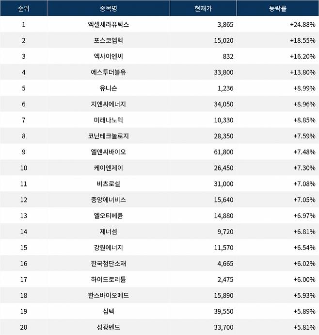 6위 지엔씨에너지(119850)는 현재가 34,050원으로 8.96% 상승 중이다. 7위 미래나노텍(095500)은 현재가 10,330원으로 8.85% 상승 중이다. 8위 코난테크놀로지(402030)는 현재가 28,350원으로 7.59% 상승 중이다. 9위 엘앤씨바이오(290650)는 현재가 61,800원으로 7.48% 상승 중이다. 10위 케이엔제이(272110)는 현재가 26,450원으로 7.30% 상승 중이다.