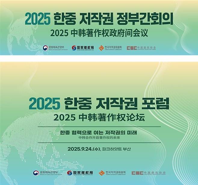 문화체육관광부는 한국저작권위원회, 중국 국가판권국과 함께 24일 부산 해운대구 파크하얏트 부산에서 '2025 한중 저작권 정부간회의'와 '2025 한중 저작권 포럼'을 연다고 밝혔습니다.