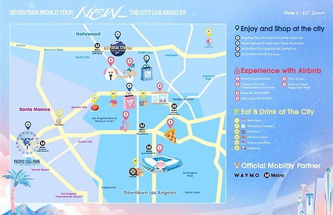 웨이모는 팬 할인 쿠폰을 제공하고, LA 메트로는 55개 역 157개 스크린과 전광판에 '세븐틴 더 시티 LA' 홍보물을 송출한다.