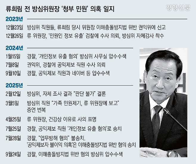 류 전 위원장은 2023년 9월 4~18일 가족, 지인에게 뉴스타파의 ‘김만배-신학림 인터뷰’를 인용한 보도를 심의해달라는 민원을 넣도록 하고, 자신이 직접 심의 절차에 참여했다는 의혹을 받았다. 이 사실이 외부로 알려지자 류 전 위원장은 ‘민원인 개인정보가 유출됐다’며 내부 감사를 벌이게 했다. 경찰은 이에 대해 ‘공익 신고자에 대한 불이익 조치’ 혐의가 있다고 판단했다.