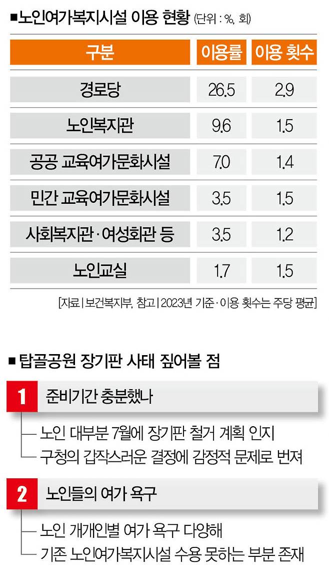 ■ 짚어볼 점② 노인 여가 욕구 = 종로구청이 노인들의 여가 활동을 제대로 이해했는지도 따져봐야 한다. 일례로 탑골공원 장기판은 자생적으로 생겨난 노인들의 여가 인프라란 특성을 갖고 있다. 이곳에 모인 노인들이 대부분 '남성'이라는 점은 이를 상징적으로 보여주는 단면이다.