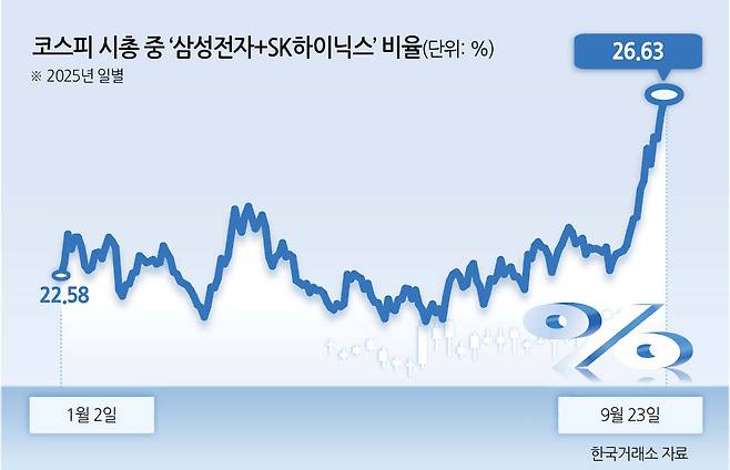코스피 시총의 4분의 1 이상을 차지하고 있는 삼성전자와 SK하이닉스 두 종목의 강세는 코스피 ‘역대 최고가’ 행진을 맨 앞에서 이끄는 원동력으로 작용하고 있는 모양새다.