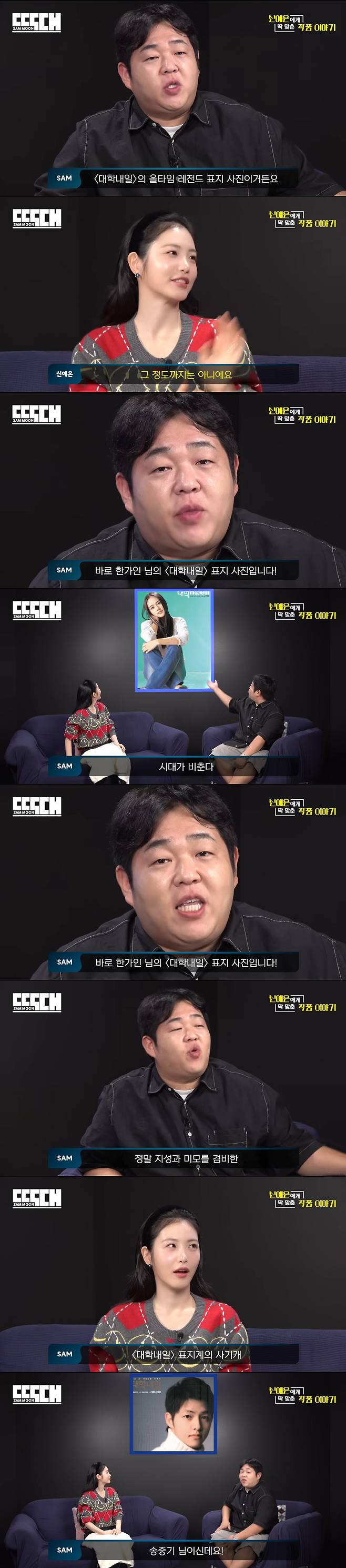 이에 문상훈은 "여러분께 보여드리고 싶은 '대학내일' 올타임 레전드 표지 사진이 있다. 끝에 점까지 너무 매력적으로 나왔다. 보시면 무조건 반한다"고 운을 뗐다. 이야기 흐름상, 자신의 사진이 나올 거라고 예상했던 신예은은 "그 정도는 아니다"고 겸손하게 웃었지만,