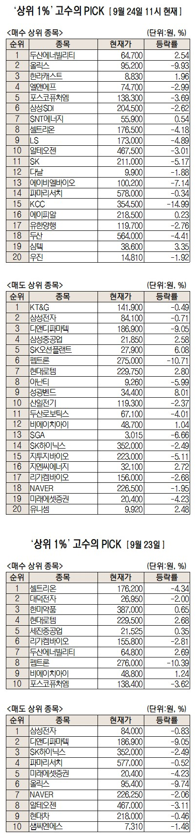 미래에셋증권은 자사 고객 중에서 지난 1개월간 수익률 상위 1% 투자자들의 매매 종목을 집계해 실시간·전일·최근 5일 기준으로 모바일트레이딩시스템(MTS) 상에서 공개하고 있다. 이 통계 데이터는 미래에셋증권의 의견과 무관한 단순 정보 안내이며 각각의 투자자 개인에게 맞는 투자 또는 수익 달성을 보장하지 않는다. 또 테마주 관련종목은 이상 급등락 가능성이 있으므로 유의해야 한다.