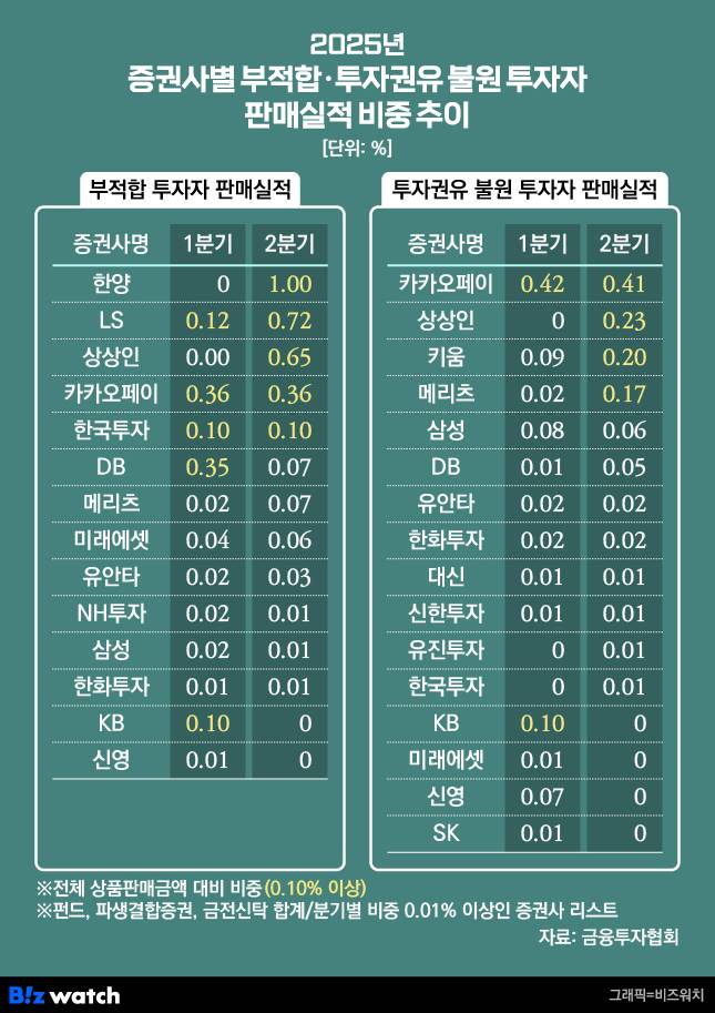 금투협이 회원사별로 취합한 '부적합·불원 판매실적' 자료를 보면, 올 1분기와 2분기 중 부적합 투자자 판매실적이 전체 판매실적의 0.1%가 넘는 증권사는 DB증권, KB증권, 상상인증권, LS증권, 카카오페이증권, 한국투자증권, 한양증권 등 7개사로 나타났다.