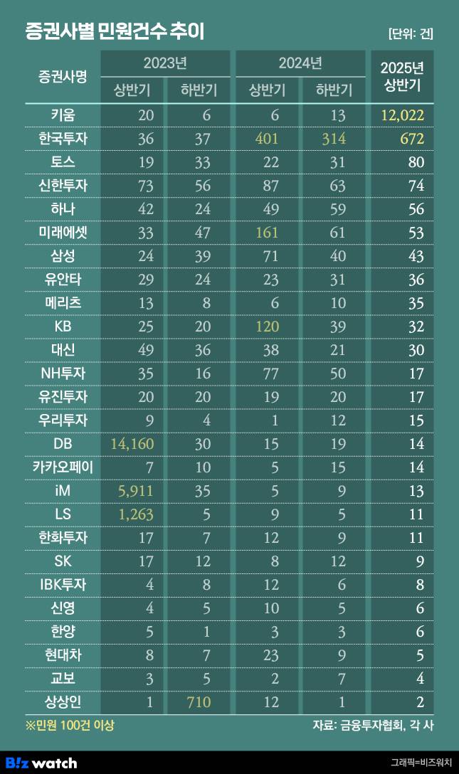 미국의 상호관세 부과와 대통령 탄핵문제로 변동성이 컸던 시기였던만큼 파장은 걷잡을 수 없이 퍼졌다. 당시 키움증권 전산장애 민원만 1만2000건이 접수됐다. 23일 금융감독원과 금융투자협회에 따르면 올 상반기 금감원과 증권회사에 제기된 증권사 상대 민원은 1만3285건으로 전년 동기(1197건)대비 1010% 급증했는데, 증가한 민원 대부분이 키움증권이다.