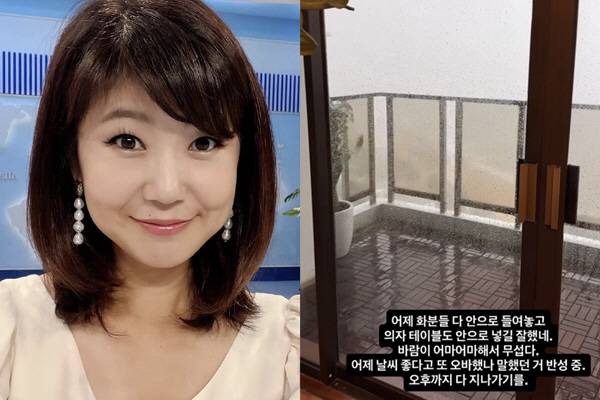 강수정은 "바람이 어마어마해서 무섭다. 어제 날씨 좋다고 또 오바했나 말했던 거 반성 중. 오후까지 다 지나가기를"이라며 태풍이 소멸되길 기도했다.