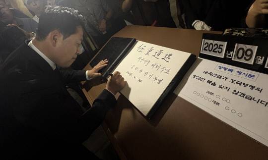 장동혁 국민의힘 대표가 24일 오후 국립대전현충원을 찾아 참배하고 방명록을 남기고 있다. 최다인 기자