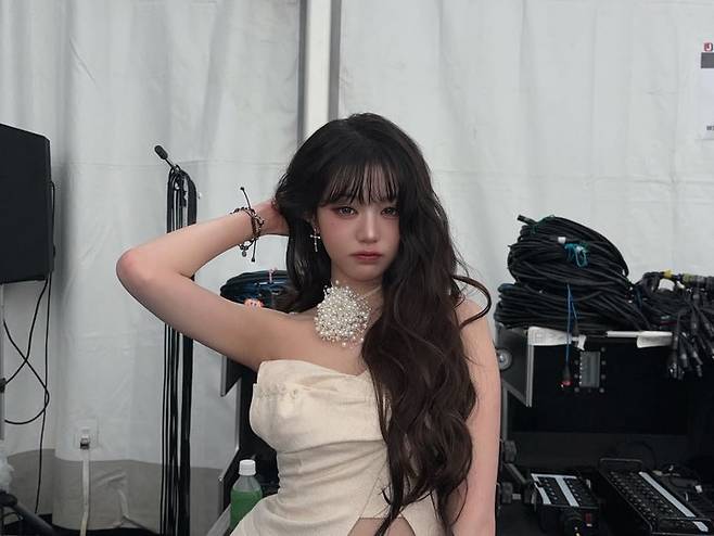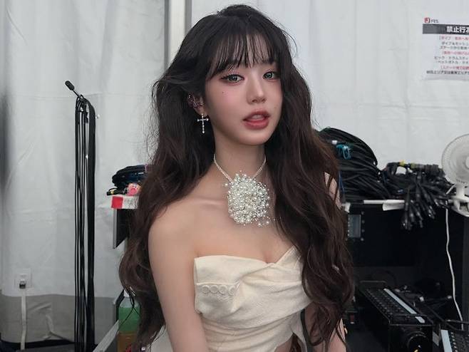 장원영은 오프숄더 디자인의 아이보리 톤 원피스를 착용해 청초하면서도 고급스러운 분위기를 풍겼다. 특히 넥라인을 장식한 큼직한 진주 포인트가 우아한 무드를 배가시켰으며, 긴 웨이브 헤어가 자연스러운 매력을 더했다.