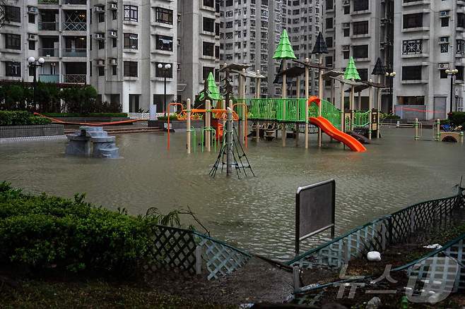 (홍콩 AFP=뉴스1) 권준언 기자 = 24일(현지시간) 태풍 라가사가 홍콩을 강타하면서 홍수가 발생해 놀이터가 물에 잠겨있는 모습. 2025.09.24.