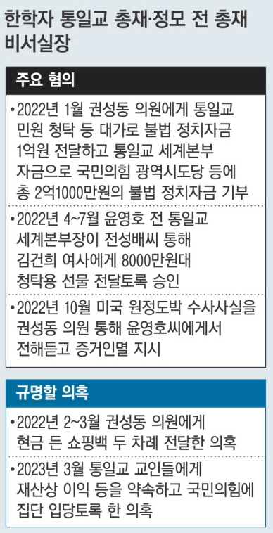 이를 위해 특검은 이날 오후 2시 권 의원과 정씨를, 오후 3시20분 한 총재를 소환해 조사했다. 권 의원에게도 현금 1억원 외에 추가로 돈을 받았는지 등을 조사한 것으로 알려졌다. 이 밖에도 특검은 한 총재 등이 2023년 국민의힘 대표 선거 직전 교인들에게 재산상 이익 등 대가를 약속하고 국민의힘에 집단 가입하게 했는지 등도 규명할 것으로 보인다. 특검은 최근 국민의힘 데이터베이스 관리업체 압수수색으로 확보한 통일교인 추정 당원 11만명의 명단 분석 작업을 진행하고 있다.