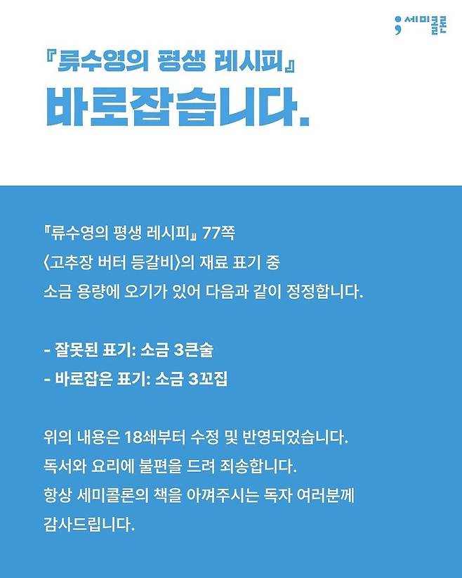 출판사 세미콜론은 23일 공식 계정을 통해 '류수영의 평생 레시피' 속 '고추장 버터 등갈비'의 재료 표기 중 소금 용량에 오기가 발견돼 수정했다는 사실을 밝혔다. 소금 3꼬집을 소금 3큰술로 잘못 오기했다고. 수정 사항은 18쇄부터 반영됐다.
