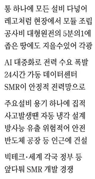 레고 블록처럼 모듈을 쌓아서 소규모 원자력발전소를 만든다. 천문학적 건설 비용과 수십 년의 시공 기간을 줄일 수 있는 것은 물론 사고 위험을 낮추고 목적에 따라 유연하게 활용할 수 있다. 빌 게이츠 마이크로소프트(MS) 창업자를 비롯해 글로벌 리더들이 촉각을 곤두세우는 이유다.