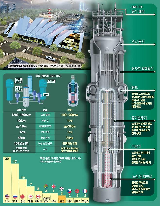 무엇보다 SMR은 대형원전에 비해 안전성이 높다. 대형원전은 원자로와 증기발생기 등 주요 기기가 따로 배관으로 연결돼 있는 구조다. SMR은 주요 기기가 하나의 용기에 들어가 있다. 사고가 발생해도 방사능 유출 위험이 상대적으로 작다.