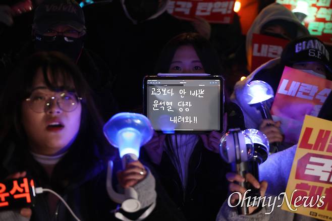 | ▲ 2024년 12월 9일 ‘내란수괴 윤석열 즉각 탄핵 시민촛불’ 집회가 서울 여의도 국회 앞에서 열린 가운데 한 시민이 '고3보다 안 바쁜 윤석열 당장 내려와!'라는 문구를 들어보이고 있다. |
