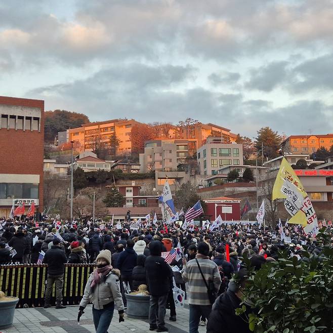 | ▲ 2025년 1월 19일 윤석열 대통령이 내란 우두머리 혐의로 구속되자 지지자들이 서울 마포구 서울서부지방법원의 담을 넘고 있다. 서부지법 창과 외벽 등이 파손돼 있다. |