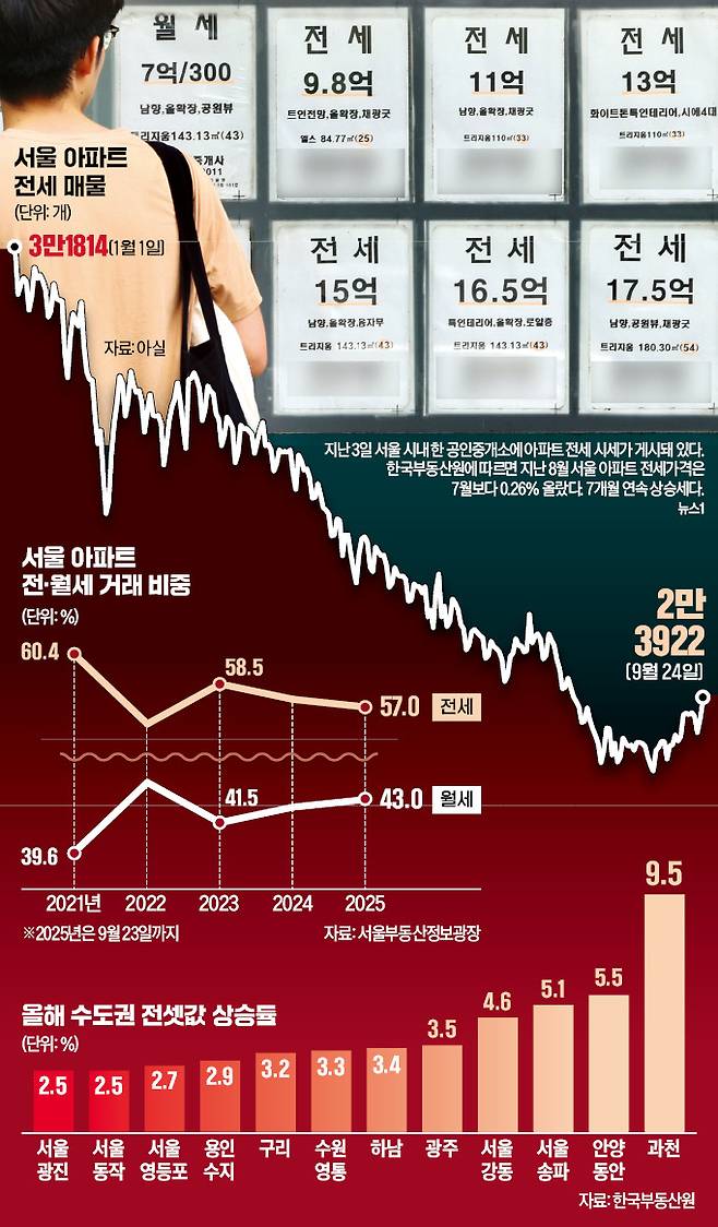 부동산 정보업체 아실에 따르면 서울 아파트 전세 물건은 24일 기준 2만3922개로, 작년 말(3만1466개)보다 24% 줄었다. 송파구 거여동 ‘송파 시그니처 롯데캐슬’은 1945가구 대단지인데도 전세 물건이 8개에 그친다. 2023년 말 132개에서 작년 말 48개로 감소하더니 올해 들어 전세 물건이 자취를 감췄다. 전셋값은 올라 전용면적 84㎡가 지난달 16일 신고가인 9억1000만원(15층)에 계약을 맺었다. 올초까지만 해도 7억원대에 전세가 나간 곳이다.