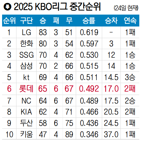 롯데는 23일 현재 3위 SSG에 5경기, 4위 삼성에 3경기, 5위 kt에 2.5경기로 승차가 벌어져 어려운 사정에 빠졌다. 남은 경기는 겨우 6차례.