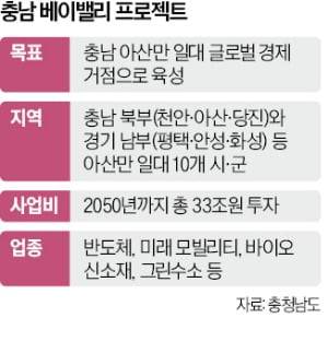 충청남도는 민선 8기 들어 베이밸리 건설을 최우선 핵심 과제로 정하고 2050년까지 33조원을 투입하는 프로젝트를 본격화했다. 이를 통해 현재 1700억달러(약 204조원)로 세계 55위 수준인 충남 GRDP를 20위권으로 견인하겠다는 목표를 세웠다. 아산만 일대는 지금도 삼성·현대 등 32만 개 기업과 인구 430만 명이 거주하고 한국 수출의 23%를 담당하는 핵심 경제권으로 꼽힌다.