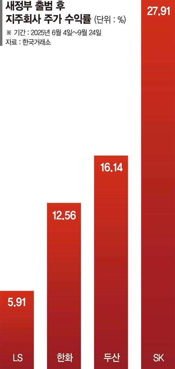 24일 한국거래소에 따르면 새정부 출범 이후(6월4일~9월24일) SK 주가는 27.91% 상승했다. 주요 지주회사로 묶이는 한화와 두산 주가도 같은 기간 각각 12.56%, 16.14% 올랐다. 삼양홀딩스(16.14%), LS(5.91%) 등도 상승세를 나타냈다.