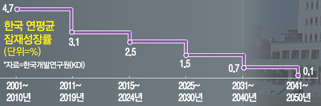 2000년대 초반 5%대에서 2010년대 3% 안팎으로 하락한 뒤 급기야 1%대로 추락한 것이다. 문제는 저출생·고령화에 따른 인구구조 악화 등으로 인해 추가 하락이 불가피하다는 점이다. 한국은행은 지난해 말 보고서를 통해 한국의 잠재성장률이 0%대로 내려앉을 것이라고 내다봤다.