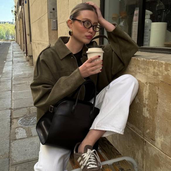 똑같은 카키 컬러의 스웨이드 재킷으로 서로 다른 룩을 연출한 버지니(@iamginiee)와 마린(@marine_diet). 버지니는 흰 티와 청바지 조합, 그리고 커다란 뱅글과 루이 비통의 로고 패턴이 돋보이는 미니 백을 매치해 캐주얼하면서도 발랄한 포인트를 더해주었습니다. 반면, 마린은 비슷한 듯하지만 화이트 팬츠, 블랙 컬러의 빅 토트백, 그리고 볼드한 이어링과 뿔테 안경을 더해 시크하면서도 클래식한 무드의 룩을 완성했습니다. 같은 재킷이라도 어떤 아이템들을 조합하느냐에 따라 분위기가 완전히 달라지죠?