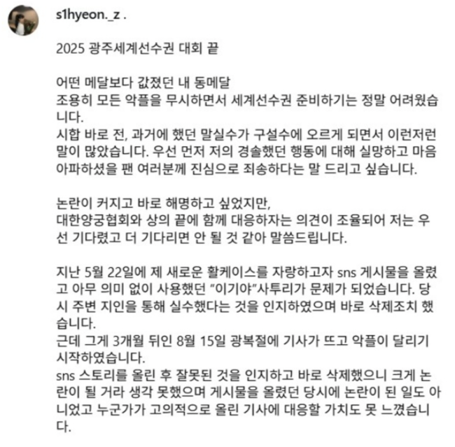 양궁국가대표 임시현(22, 한국체대)이 일베논란에 대해 사과했다.