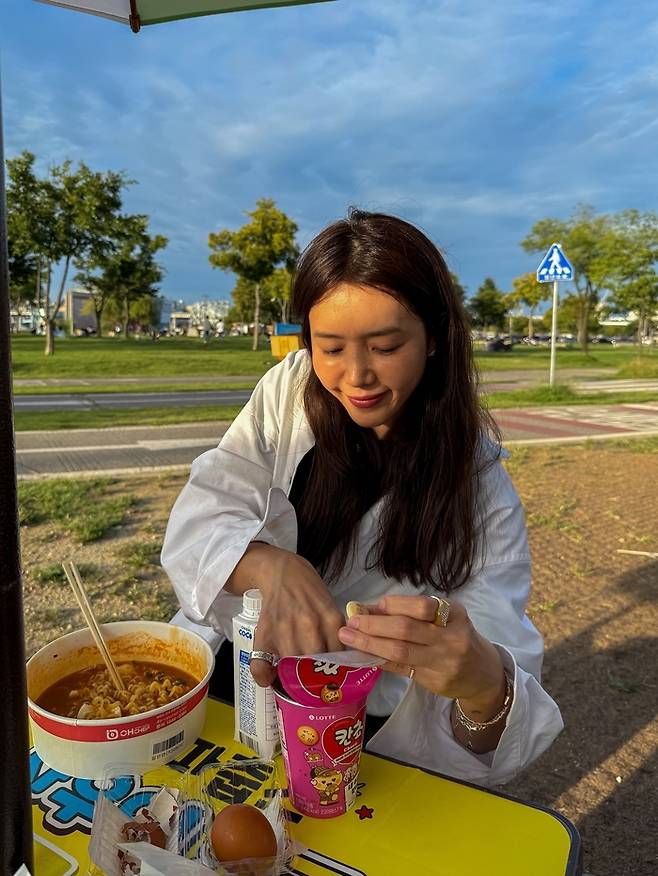 공개된 사진 속 채정안은 흰 셔츠에 검은색 바지를 매치한 편안하면서도 스타일리시한 패션으로 한강을 찾았다. 또 다른 사진에서는 한강의 명물인 즉석 라면을 즐기는 모습이다.