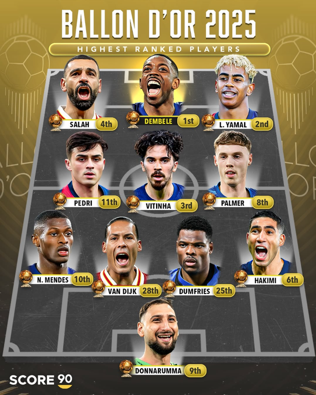 화려한 공격진이다. 1위 뎀벨레가 최전방, 2위 야말과 4위 살라가 좌우 측면을 구성했다. 중원은 3위 비티냐, 8위 팔머, 11위 페드리다. 수비에서는 가장 높은 6위 하키미를 비롯해 둠프리스(25위), 반 다이크(28위), 멘데스(10위)가 선정됐다. 골문은 9위 돈나룸마가 지킨다. 다만 5위 하피냐, 7위 음바페는 탈락했다.