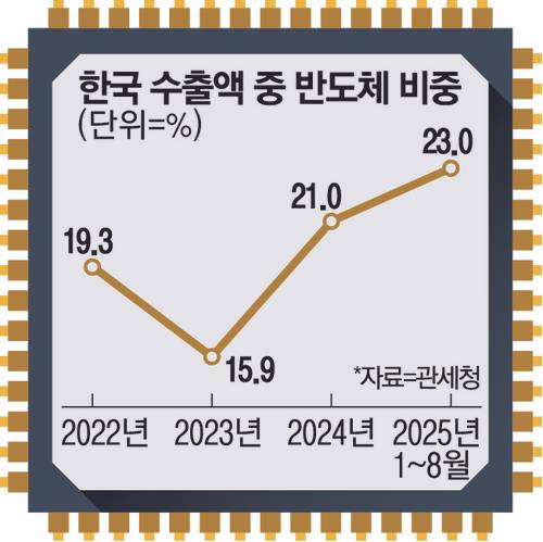 24일 관세청에 따르면, 올해 1~8월 중 반도체 수출액은 1042억94만달러로 전년 동기 대비 15.7% 증가했다. 이에 따라 반도체가 한국의 전체 수출액에서 차지하는 비중이 23.0%로 높아졌다. 2023년까지만 해도 전체 수출액의 15.9%였던 반도체 비중은 지난해 21.0%로 올라선 데 이어 올해 비중이 더 확대된 것이다.