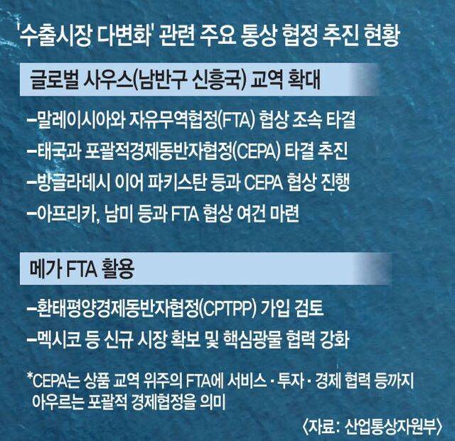 기존 한·아세안 자유무역협정(FTA)을 넘어 말레이시아 태국 등과 맞춤형 '1대 1 FTA'를 추진하고, 일본 멕시코 등 12개국이 속한 포괄적·점진적 환태평양경제동반자협정(CPTPP) 가입 검토 방침도 5년 만에 공식화했다.