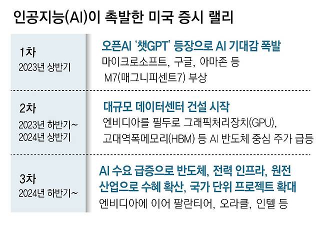 여기에 AI의 산업화가 3차 랠리에 불을 붙였다. AI와 빅데이터를 활용해 정보 분석 서비스를 제공하는 팔란티어도 존재감이 커졌다. 소프트웨어(SW) 기업 오라클도 깜짝 실적을 발표하면서 주가가 급등했다. 막대한 전력이 소모되는 데이터센터가 증가하면서 전력 효율을 대폭 개선한 AI 반도체와 데이터센터에 전력을 공급할 소형모듈원자로(SMR), AI 추론 모델을 위한 낸드플래시 등의 수요가 대폭 늘었다.