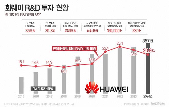 화웨이의 2024년 매출액 대비 R&D 투자비중은 20.8%에 달한다. 한국을 대표하는 삼성전자(11.6%)와 SK하이닉스(7.5%)를 훌쩍 뛰어넘는다. R&D 투자액으로도 한국 기업들을 넘어선 것은 물론 알파벳과 메타, 애플, MS, 폴크스바겐 등 굴지의 글로벌 기업들에 이은 6위를 기록했다.