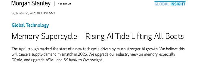 꼭 1년 전 '반도체 겨울이 온다'고 경고하며 메모리 반도체 주가 하락을 불러왔던 모건스탠리는 지난 21일 "메모리 수퍼사이클 - AI의 밀물이 모든 배를 띄운다"는 제목의 보고서를 내고 메모리 반도체 업종에 대한 투자 의견을 기존 '중립(in-line)'에서 '매수 매력(attractive)'으로 상향했습니다.