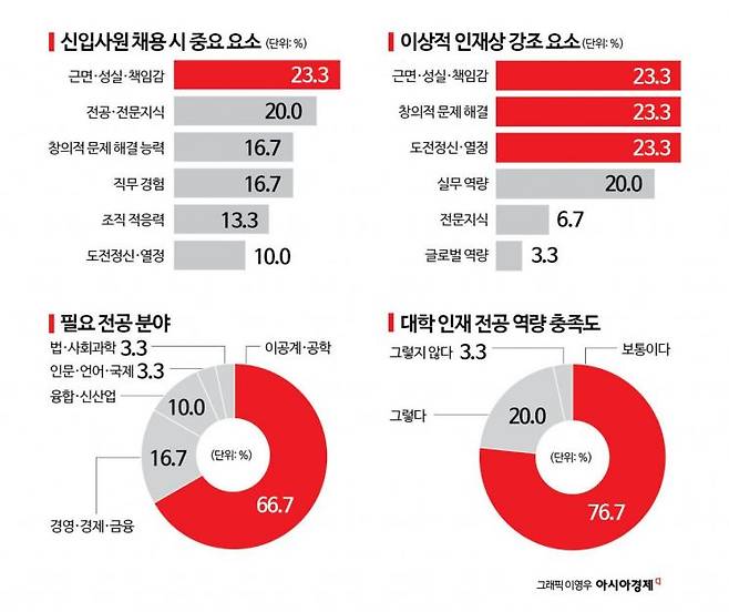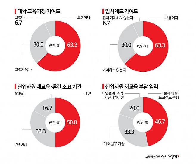 25일 아시아경제가 지난 15일부터 19일까지 주요 30대 기업 인사·채용 담당자를 대상으로 실시한 '기업이 원하는 인재와 대졸 인력 간 미스매칭 진단' 설문조사 결과에 따르면 '대학 교육이 기업이 필요로 하는 이상적 인재 양성에 기여한다'고 답한 곳은 2곳(6.7%)에 그쳤다. 나머지 28곳(93.3%) 가운데 19곳(63.3%)은 '보통 수준'이라고 응답했고, 9곳(30.0%)은 '도움이 되지 않는다'고 평가했다. 대학 교육이 산업 인력 수요를 따라가지 못하는 미스매칭 현상이 굳어지고 있는 것으로 풀이된다.