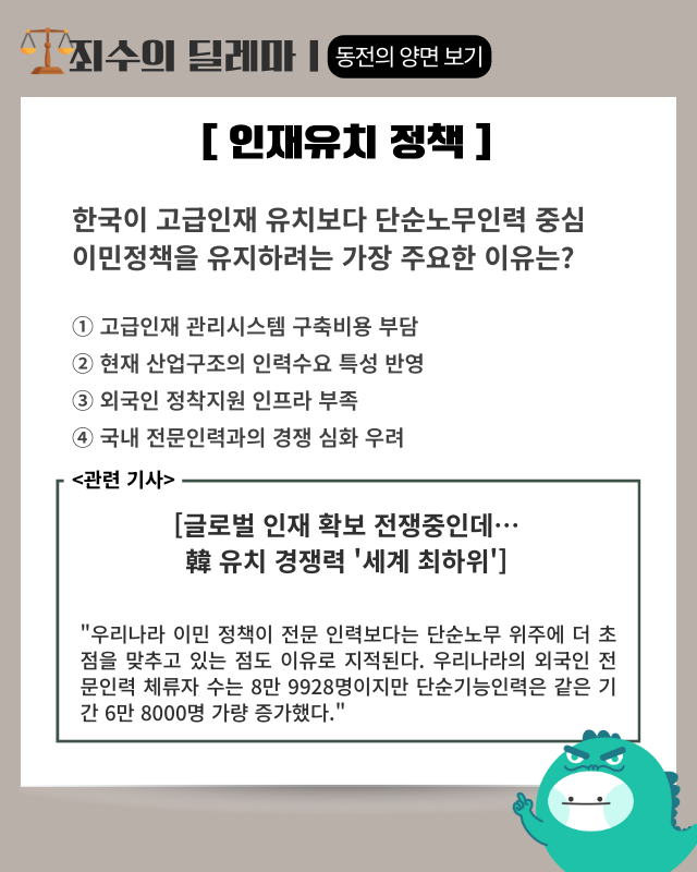 ■ 인재유치 위기: 한국의 세계 숙련 노동자 유치 경쟁력이 OECD 38개국 중 25위에 그치며 글로벌 인재 확보에 적신호가 켜졌다. 외국인 취업 기회와 가족 동반 환경에서 선진국 대비 매력도가 현저히 떨어지는 것으로 분석됐다.