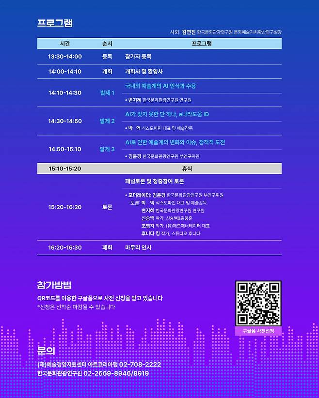 토론에서는 예술인, 연구자, 기업가, 청중이 함께 참여해 현장의 생생한 의견을 나눈다. 특히 AI를 활용한 예술 창작 및 연구 활동을 활발히 펼치고 있는 신승백, 조영각, 후니다 킴 작가가 패널로 참여해 논의에 깊이를 더할 예정이다.