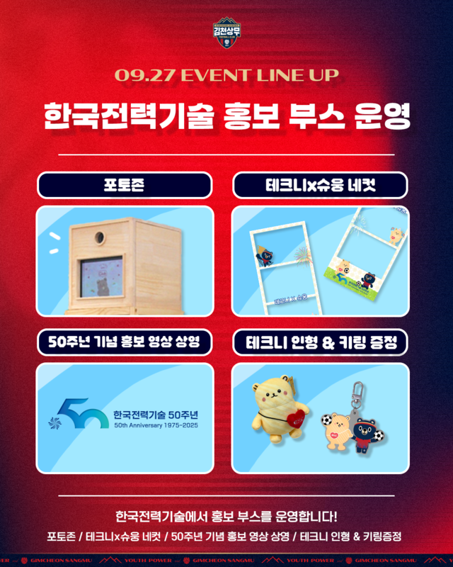김천은 오는 포항전 홈경기에서 한국전력기술 브랜드데이를 맞아 신선하고 다양한 이벤트를 준비한다. 김천시에 본사를 둔 한국전력기술은 국내 대부분의 원자력 및 화력발전소를 설계한 우리나라 대표 엔지니어링 공기업으로서, 해상풍력을 비롯한 신재생에너지와 AI기반 디지털 엔지니어링을 수행하는 친환경 에너지 기술 회사이다. 올해로 창립 50주년을 맞이하여 축구팬을 포함한 국민에게 한 걸음 더 다가가기 위해 김천상무와 함께 브랜드데이를 진행한다.
