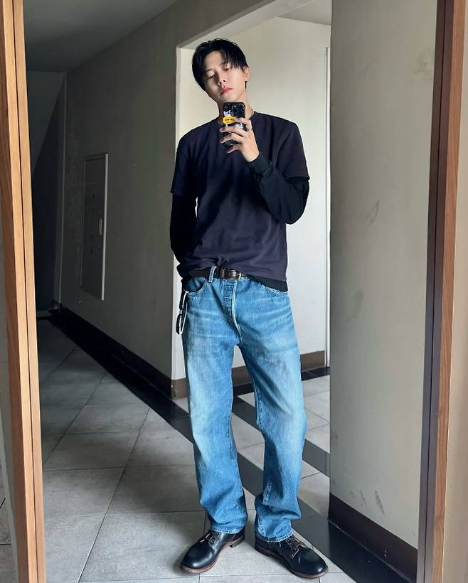 주우재는 차콜 컬러 반팔 티셔츠와 블랙 컬러 롱슬리브를 톤온톤 매치했다. 스트레이트 핏의 데님과 클래식한 부츠를 함께 착용해 깔끔하면서도 힙한 코디를 꾸몄다. 아래 컷에서는 다른 방식의 컬러 조합을 활용했다. 롱슬리브와 팬츠 컬러를 맞춰 유니크한 스타일을 완성했다.