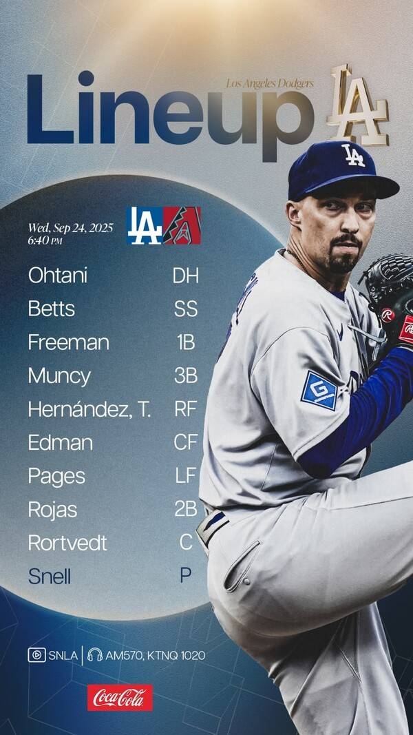 다저스는 25일(한국시간) 미국 애리조나주 피닉스 체이스 필드에서 열리는 2025 메이저리그(MLB) 정규시즌 애리조나 다이아몬드백스와 원정 경기에 앞서 선발 라인업을 발표했다.