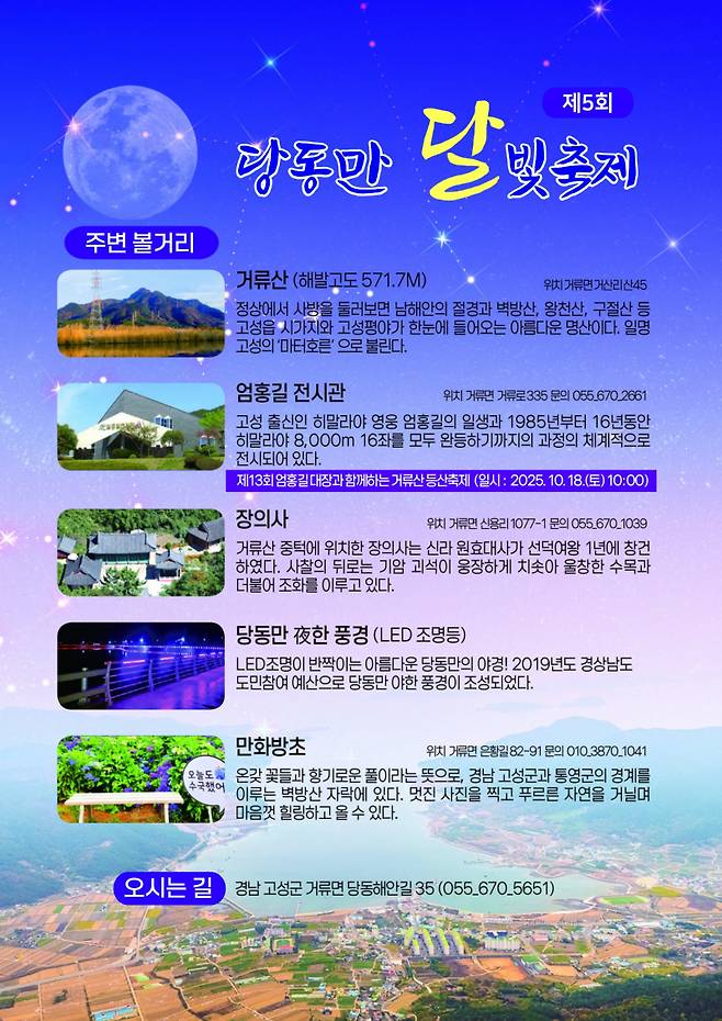 고성군 거류면(면장 유정옥)은 10월4일 거류면 당동만 당동해안길 일원에서 민속 고유 명절인 추석을 맞아 한반도 지형을 닮은 제5회 당동만 달빛축제를 개최한다.