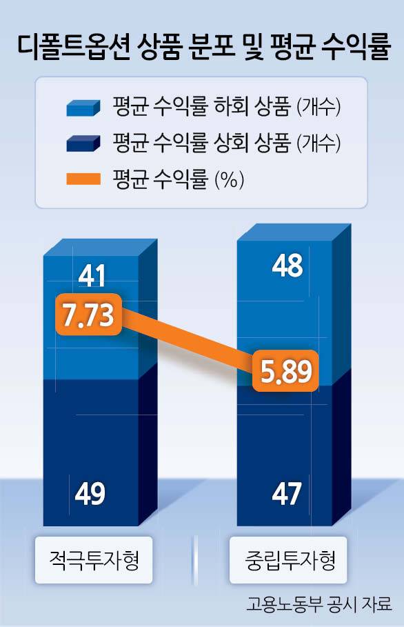 고용노동부의 2분기 사전지정운용방법(디폴트옵션) 주요 현황 공시에 따르면 적극투자형 포트폴리오의 평균 수익률은 7.73%, 중립투자형은 5.89%였다. 평균을 밑돈 상품 수는 각각 90개 중 41개, 95개 중 48개였다. 안정투자형은 은행 예금 금리에 연동돼 운용사 펀드 성과와 무관하다.